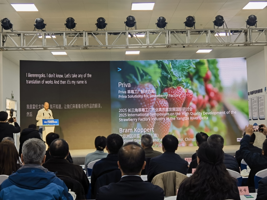 今天的论坛上,中国工程院院士、浙江大学农业生命环境学部主任喻景权教授应邀作首场特邀报告,深入剖析了园艺作物工厂化生产面临的机遇与挑战,强调通过智能环境调控突破传统栽培瓶颈。来自荷兰Priva公司亚太区总监Bram Koppert、美国AEssense集团中国副总经理宋一鹏等国际专家,分别分享了全球领先的智能环境控制系统与气雾培技术解决方案,为草莓工厂化生产提供了国际化视野。